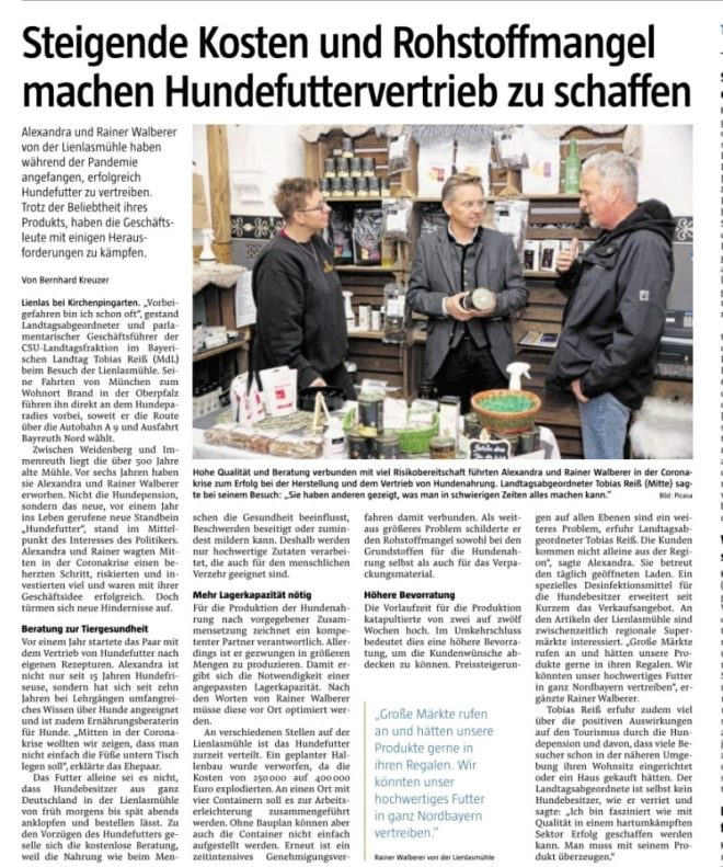 Steigende Kosten und Rohstoffmangel machen Hundefuttervertrieb zu schaffen AllgemeinVon Verena Schuller-Ohla4. Januar 2023Unser Artikel aus dem Neuen Tag.