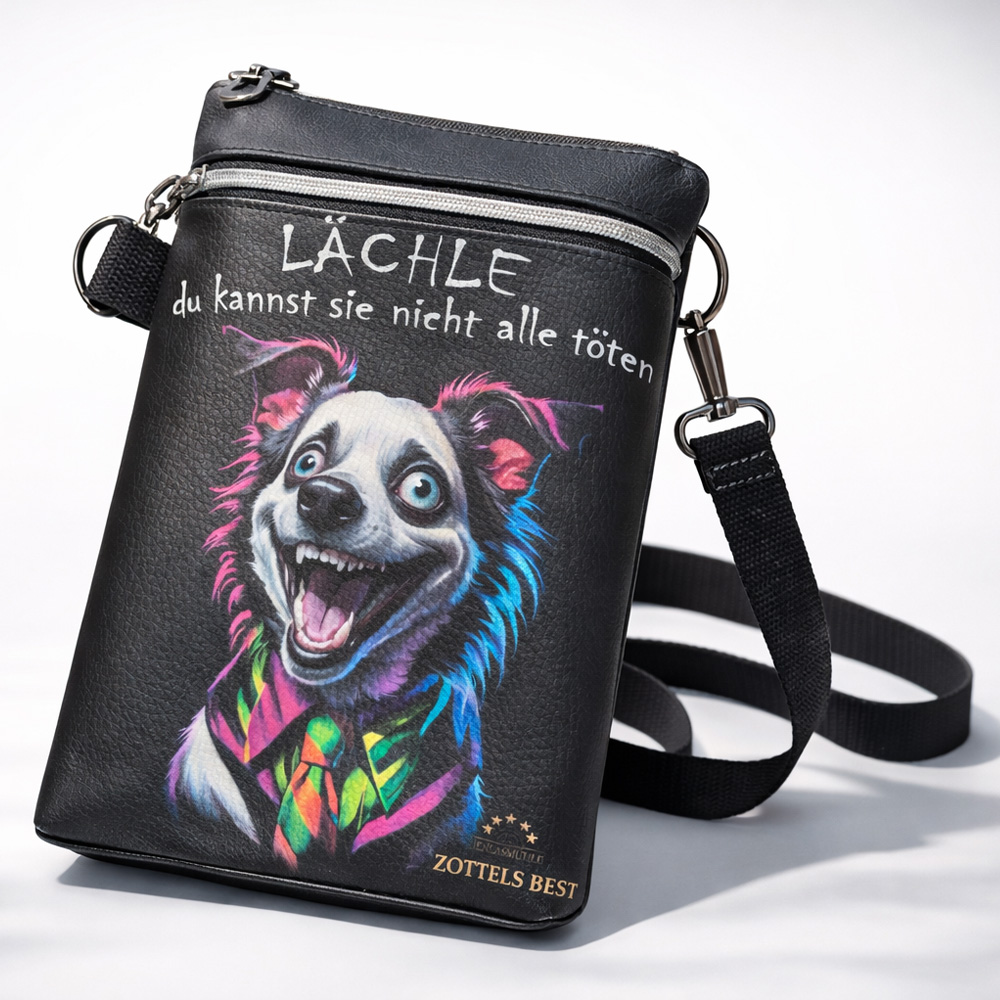 Ein bisschen provokant, etwas sarkastisch und auch ziemlich verrückt, das geben wir schon zu. Aber ich glaube jeder kennt das irgendwie. Hunde sind toll, Menschen sind doof, so könnte man das wohl umschreiben. Da hilft einfach nur: Die Gedanken sind frei, wer kann sie erraten. Und mit (d)einem charmanten Lächeln kannst du alle besiegen. Wir finden, diesem zugegenermaßen etwas irren Lächeln unseres Models kann niemand etwas entgegensetzen 🙂 Wenn du dich in dieser Tasche wiedererkennst, schlag einfach zu (also kaufen meinen wir).