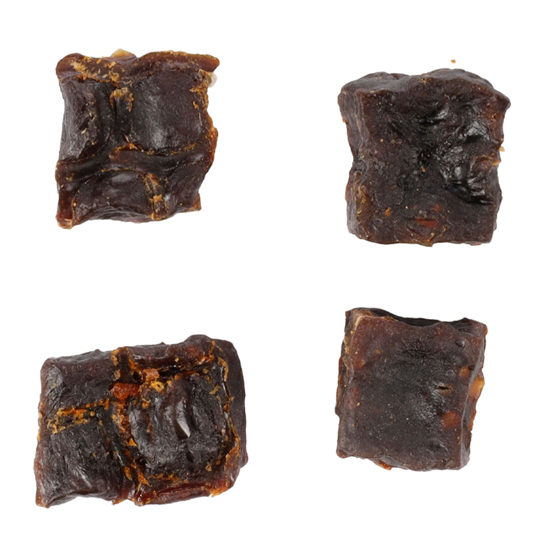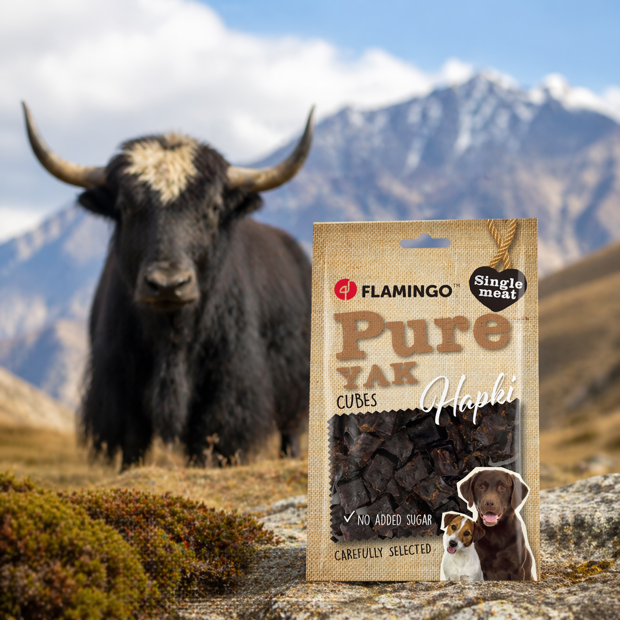 Zusammensetzung: Yakfleisch & -herz (77%), Yak-Weichknochen (10%), Glyzerin, Stärke, Weizenmehl, Pflanzenprotein, Natriumchlorid. Zusatzstoffe:technologische Zusatzstoffe: Konservierungsmittel. Analytische Bestandteile: