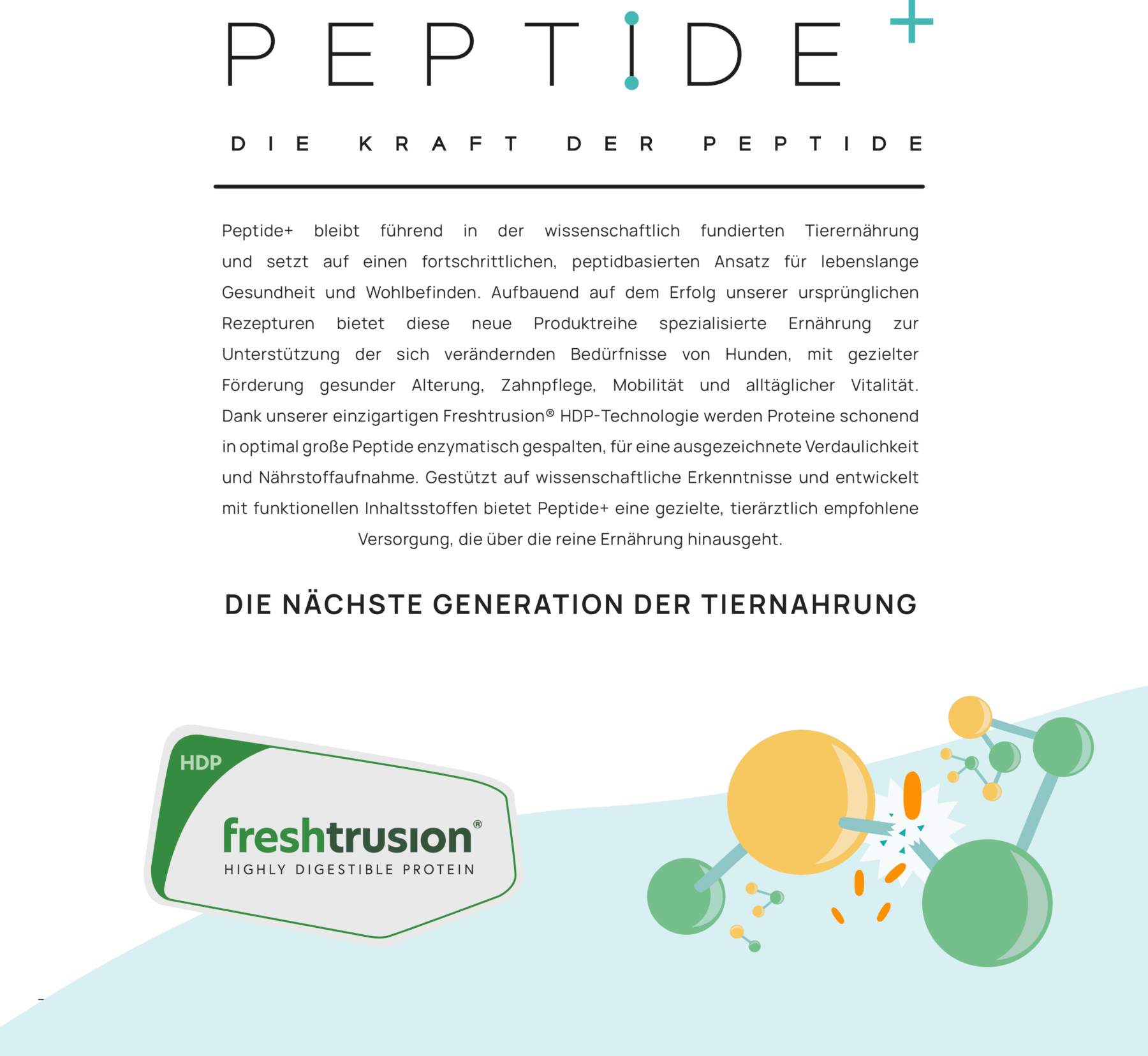 ZOTTELS BEST VETCARE PEPTIDE setzt neue Maßstäbe in der modernen Hundeernährung. Die Rezeptur basiert auf der „Kraft der Peptide“ und nutzt die innovative Freshtrusion® HDP-Technologie (Highly Digestible Protein).